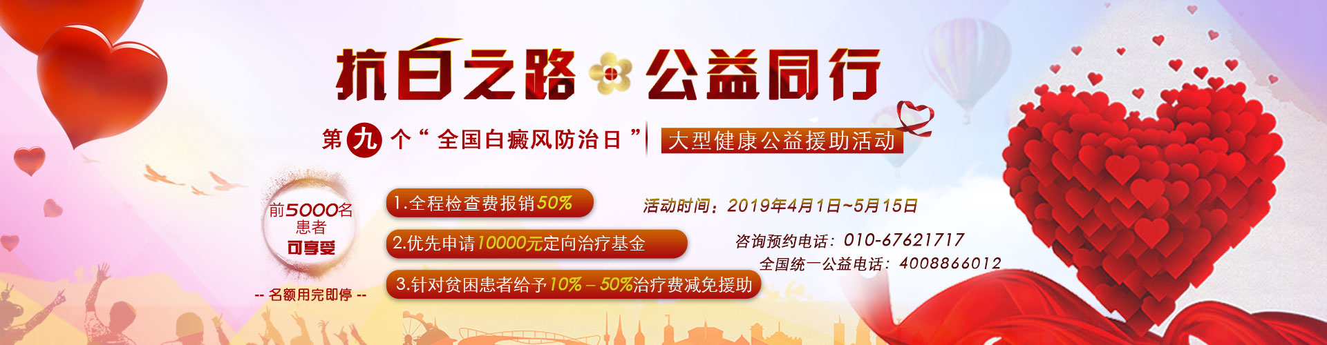 为迎接第九个“全国白癜风防治日”的到来,北京方舟医院作为中国红十字基金会“全国白癜风/银屑病救助计划”全国定点临床执行医院,联合红基会“救助计划”项目部,启动专项救助基金,于2019年4月1日至5月15日开展《抗白之路,公益同行》大型健康公益援助活动。