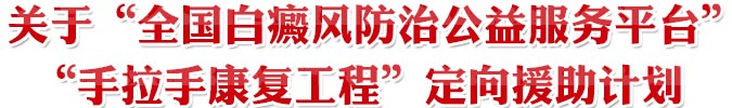 为了响应国家"十二五规划"关于深化医药卫生体制改革规划暨实施方案,截止到2014年6月4日,为期3年的援助一万名贫困白癜风患者活动已经圆满结束,为了能充分帮助更多的患者走出白癜风的阴影,重新拥有健康的皮肤,同时也为了统计我国白癜风患者的发病率及治疗现状,全国白癜风防治公益服务平台将联合全国唯一的定点医院――北京方舟医院,在2015年启动"手拉手康复工程大型公益活动"。目的是在全国白癜风公益服务平台的大力支持下,结合社会公益机构和白癜风病人的力量,凝聚白癜风公益基金,然后应用于白癜风患者的专向治疗,同时为"公益平台"统计白癜风疑难皮肤病的发病率及就诊率提供科学的参考数据。